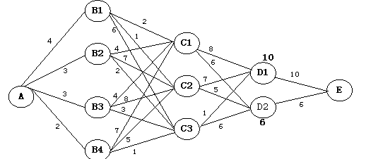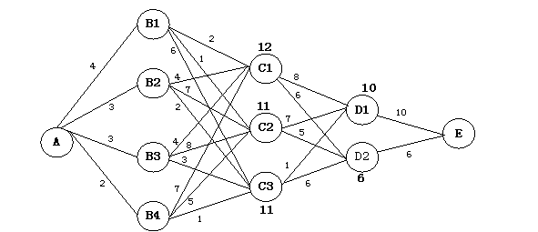 【例】如下图所示,给定一个运输网络,两点之间连线的数字表示两点间的距离,试求一条从A到E的运输线路,使总距离为最短。