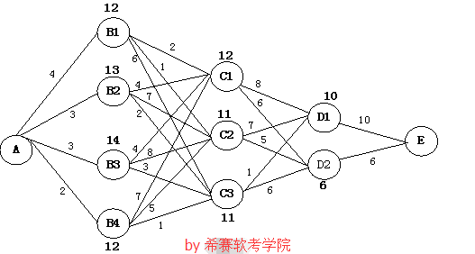 从而可知从A到E的最短距离为14。路径是A-B4-C3-D1-E。