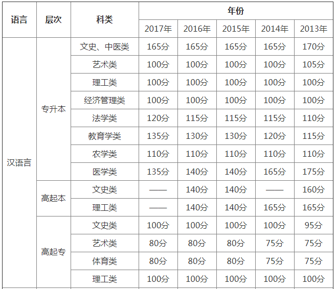 以下是2013年-2017年新疆成人高考历年录取分数线。