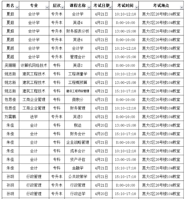 关于黑龙江大学成人高考函授毕业需要补考的同学,黑龙江大学公布了补考名单,供参考。