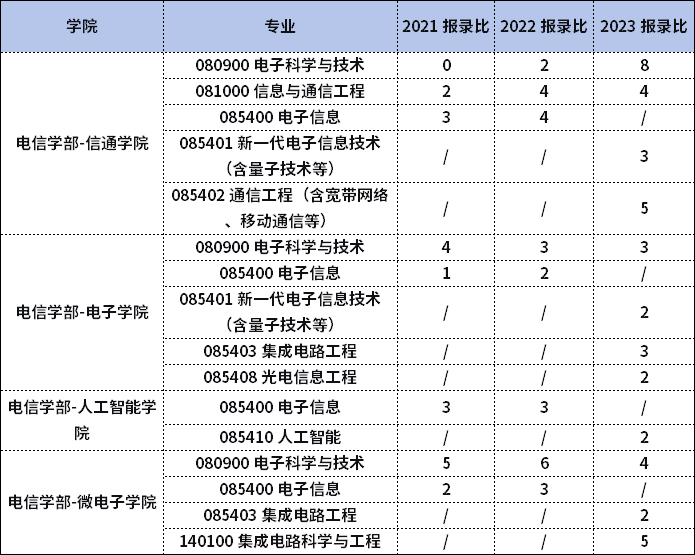 西安交通把电子信息方向拆分到了不同学院,其中电子与信息学部(信息与通信工程学院)考试科目为政治+英二+数二+信号与系统。25年总招生24人,一志愿录取最低分为379分,录取最高分为418分。专业分给分120分以上为百分之75。复录比为1.5:1,从复试情况来看复试只淘汰了低分段考生,没有歧视双非,学校相对友好。下面看看报录比情况。