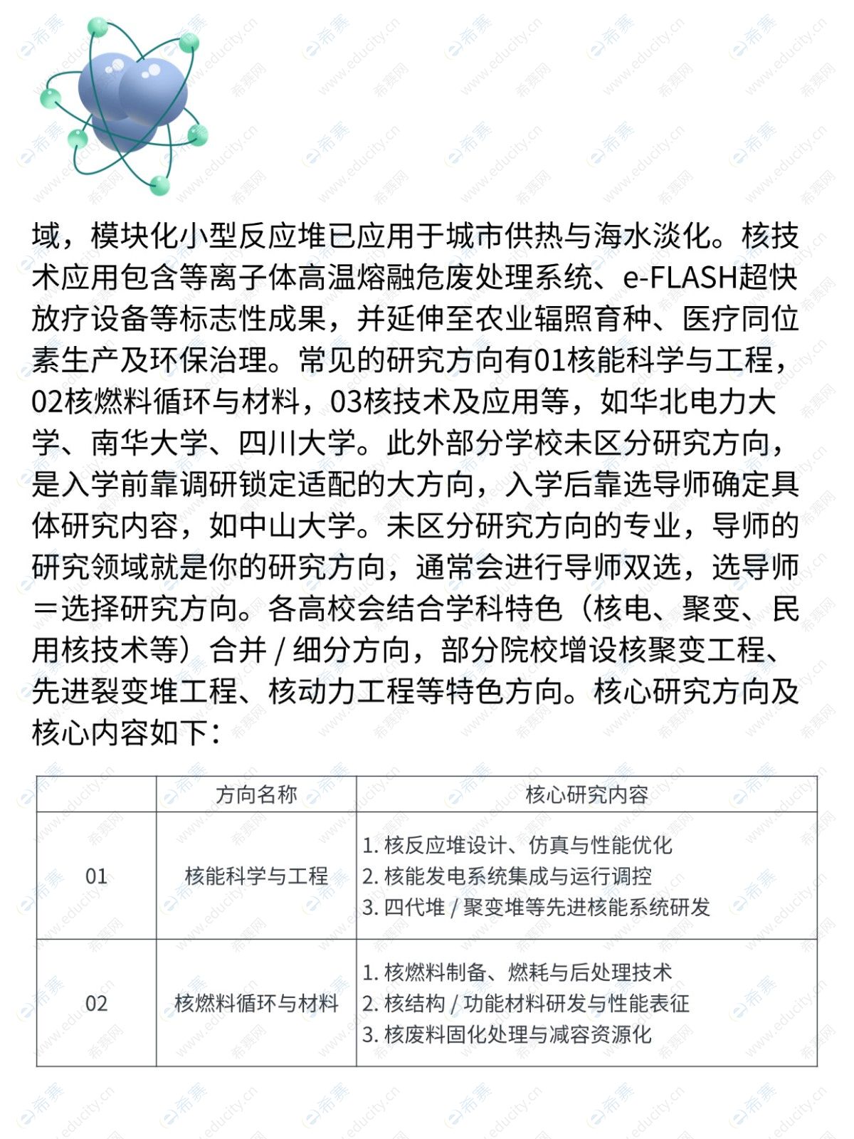 涵盖核能科学与工程(反应堆设计、先进核能系统研发)、核燃料循环与材料(核燃料制备、核废料处理)、核技术及应用(同位素研发、医疗 / 农业核技术)、辐射防护与环境保护(辐射监测、核设施去污),部分院校增设核聚变工程等特色方向;未区分方向的专业可通过选择导师确定具体研究内容。