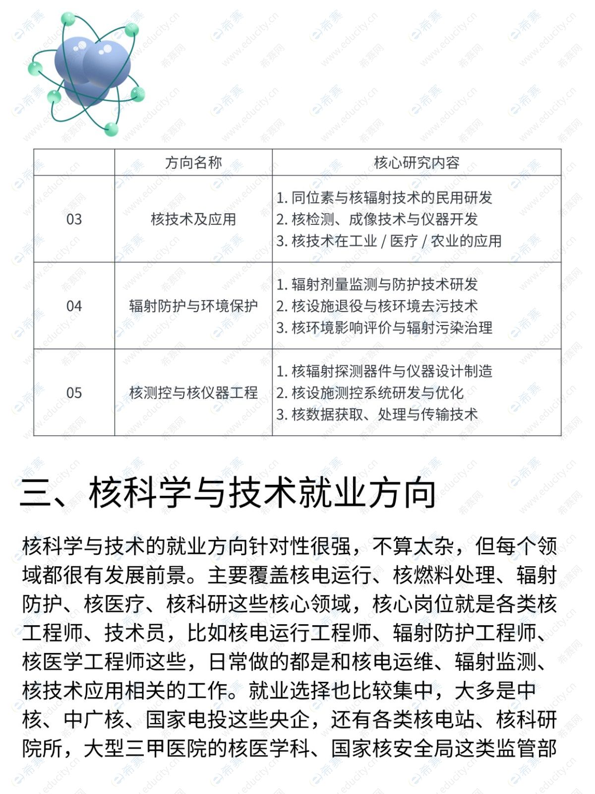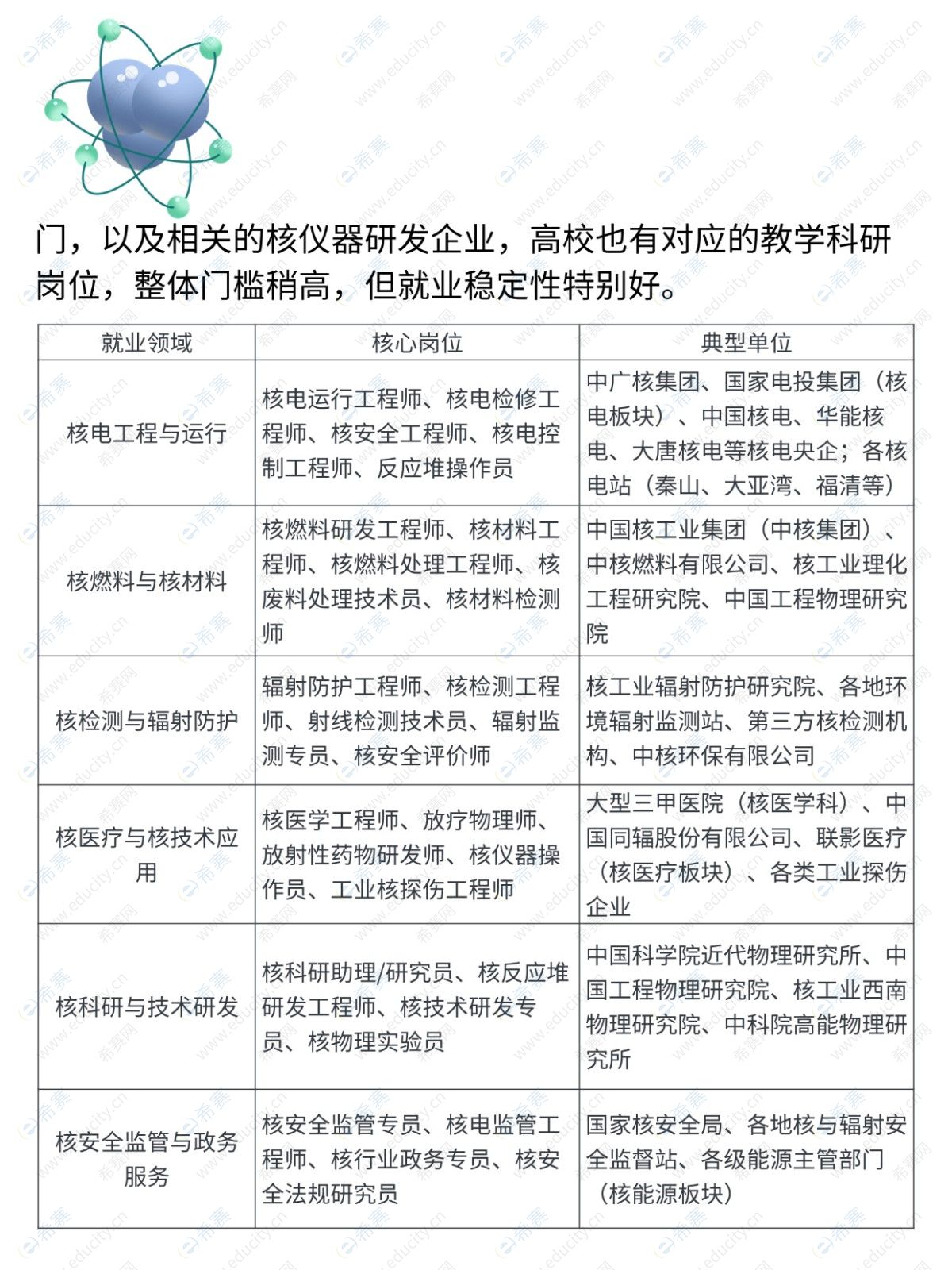 就业针对性强、稳定性高,核心领域包括核电工程、核燃料研发、辐射防护、核医疗等,典型单位为中广核、中核集团等央企,核电站、科研院所、三甲医院核医学科、国家核安全局等;核心岗位为核工程师、技术员,门槛稍高但职业发展稳定。