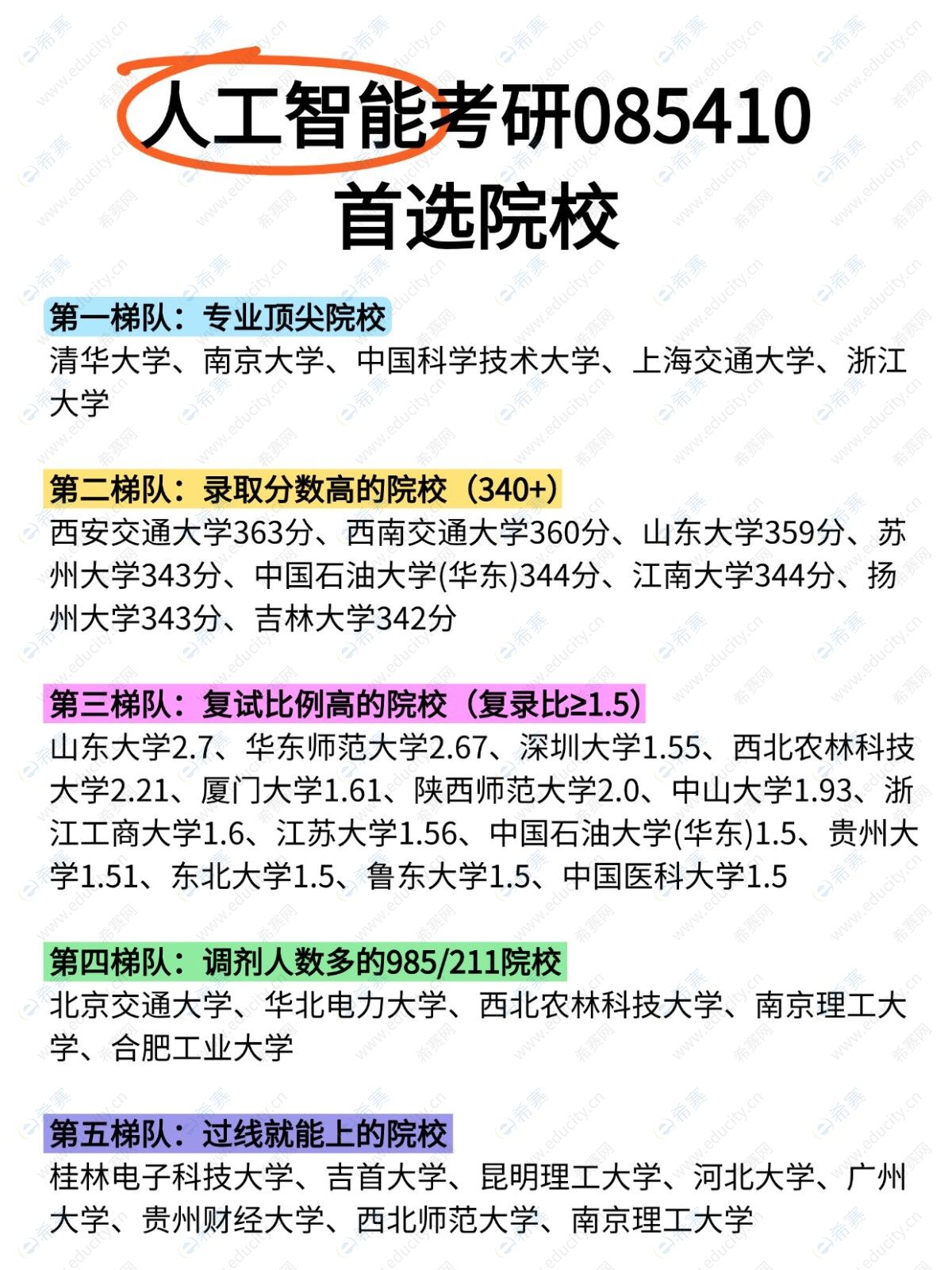 摘要:人工智能考研最稳的学校,第一梯队专业顶尖院校,清华大学、南京大学;第二梯队录取分数高的院校,西安交通大学;第三梯队复试比例高的院校,山东大学;第四梯队调剂人数多的院校,北京交通大学、华北电力大学;第五梯队过线就能上的院校,吉首大学