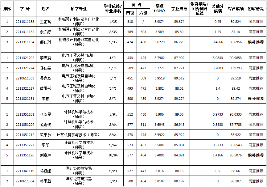 经学生个人申报、学院组织现场答辩和专家小组审核,拟定推免生初选名单15人(其中候补推荐3人)如下并予以公示: