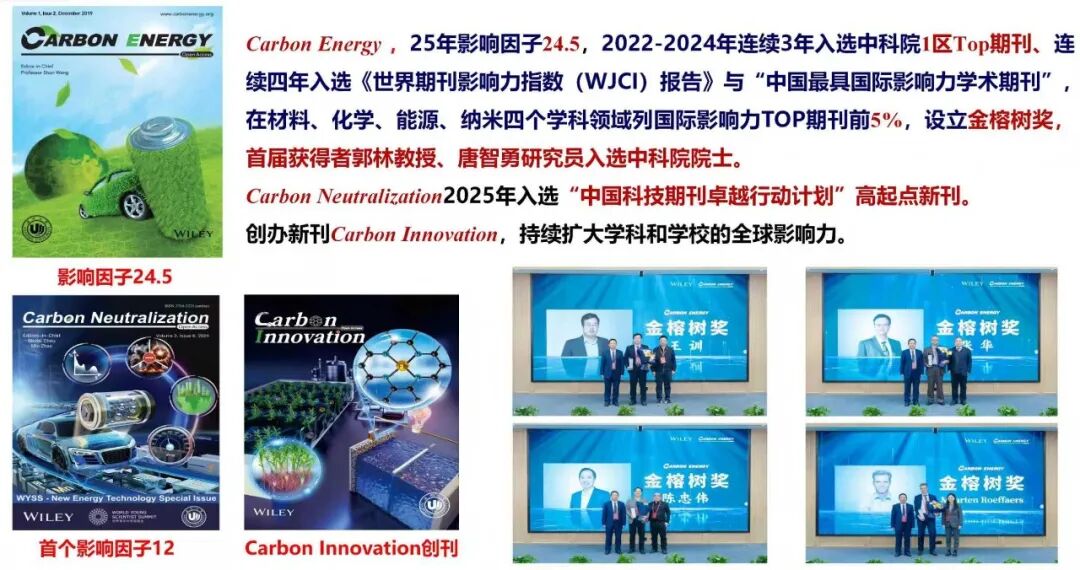 学院积极开展学术交流与合作,每年定期举办国际碳能源大会、世界青年科学家峰会、瓯江高端学术论坛等学术会议。成功创办国际高水平期刊Carbon Energy(IF24.5)、Carbon Neutralization (IF12)和Carbon Innovation 、Carbon Energy 连续多年入选中科院1区Top期刊、中国最具国际影响力学术期刊,在材料、化学、能源、纳米四个学科领域列国际影响力TOP期刊前5%,设立金榕树奖、金茶花奖。