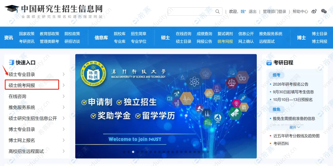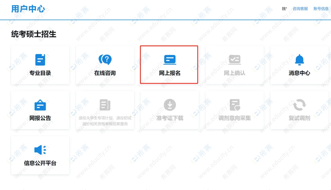 1.登入“中国研究生招生信息网”(https://yz.chsi.com.cn/),进入网报页面。