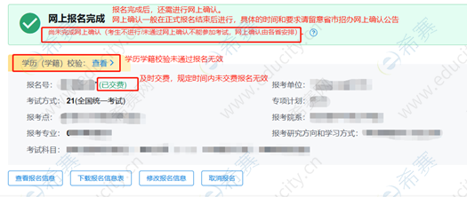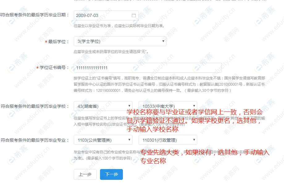 (1)输入的基本信息是否与学信网一致:包括毕业时间,专业,学校名称,证书编号、最后学历的学习形式等。