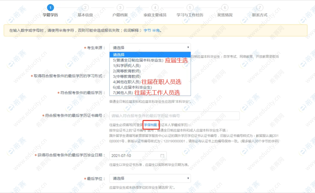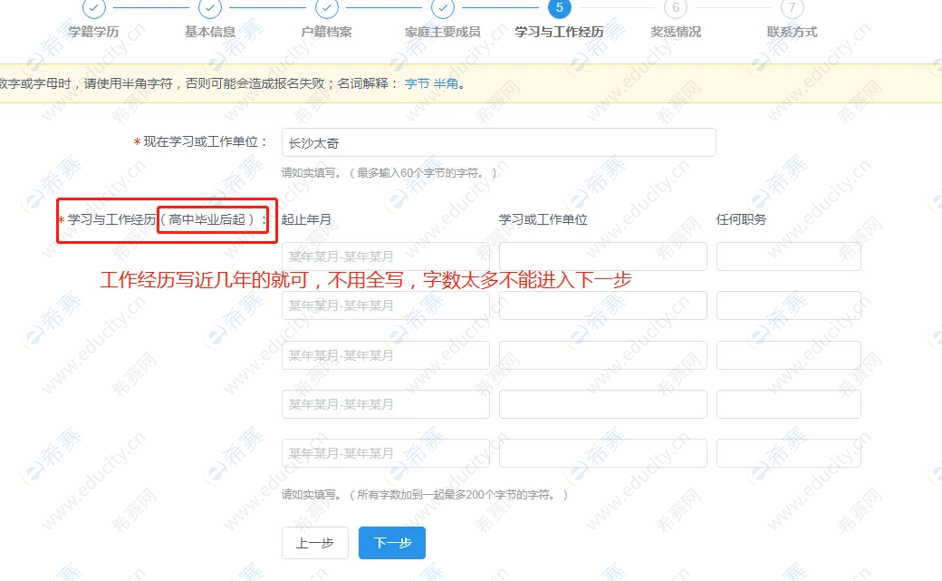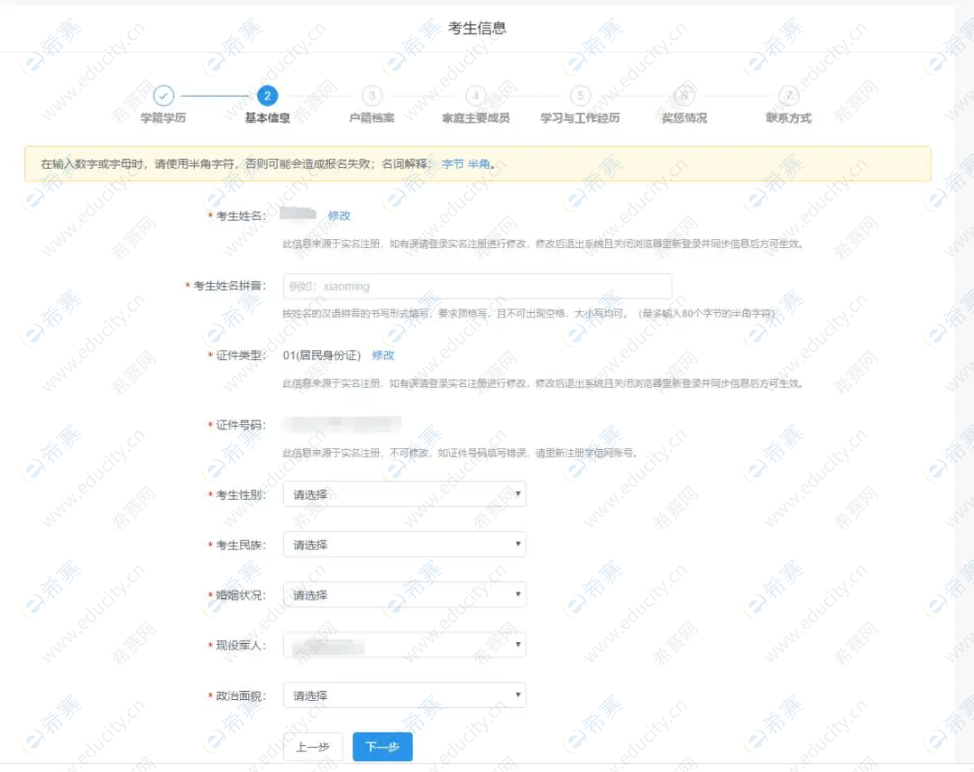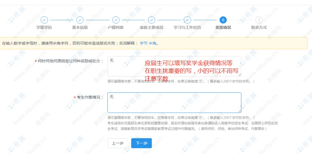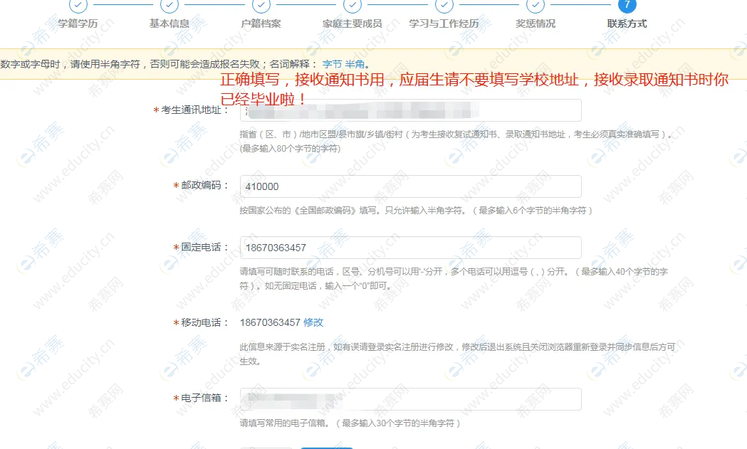 9.继续填写报考信息(含基本信息、户籍档案、家庭主要成员、学习与工作经历、奖惩情况和联系方式)
