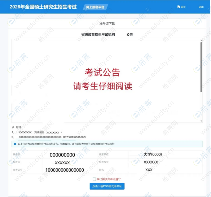 各位考生请注意,这个页面上的提示一定要认真阅读,然后勾选“我已阅读并承诺遵守”后,再点击“下载PDF格式准考证”的按钮。