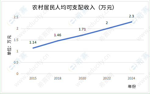 The line chart clearly demonstrates the consistent growth in the per capita disposable income of China’s rural residents from 2015 to 2024. Starting at 11,400 yuan in 2015, the figure rose steadily to 14,600 yuan in 2018 and 17,100 yuan in 2020. This upward trend continued, reaching 20,000 yuan in 2022 and climbing to 23,000 yuan by 2024, showing a doubling of income over the decade.