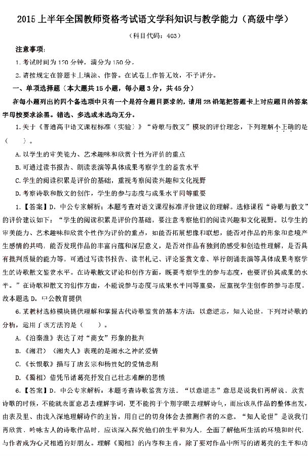 摘要:2015年上半年教师资格证笔试真题及答案:《高中语文》