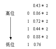 十进制小数转换为R进制小数,则采用"乘以R取进位法".例如,将十进制小数0.43转换成二进制小数的过程如下(假设要求小数点后取5位):