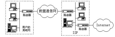 所谓"通过局域网接入互联网",是指用户通过局域网,局域网使用路由器通过数据通信网与ISP相连接,再通过ISP接入互联网。图2-4显示了通过局域网接入互联网的结构。