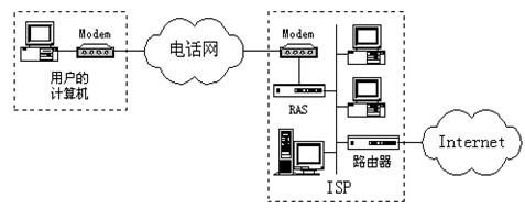 用户的计算机与ISP的远程接入服务器(RAS,Remote Access Server)均通过调制解调器与电话网相连。用户在访问互联网时,通过拨号方式与ISP的RAS建立连接,通过ISP的路由器访问互联网。在用户端,既可以将一台计算机直接通过调制解调器与电话网相连,也可以利用代理服务器将一个局域网间接通过调制解调器与电话网相连。由于电话线支持的传输速率有限,目前较好线路的较高传输速率可以达到50Kbps左右,一般线路只能达到30-40Kbps,而较差线路的传输速率会更低。因此,这种方式只适合于个人或小型企业使用。