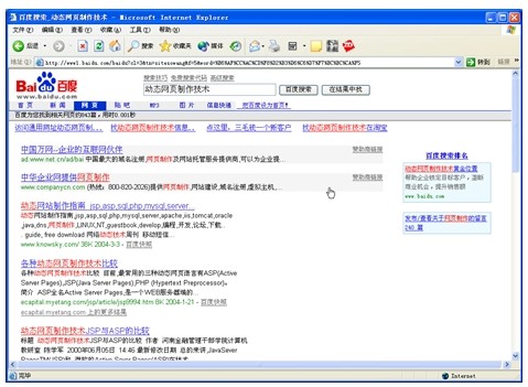 很快,就会看到在窗口中出现的搜索结果,如图2-10所示,百度中文搜索引擎找到843个包含"动态网页制作技术"内容的网页。