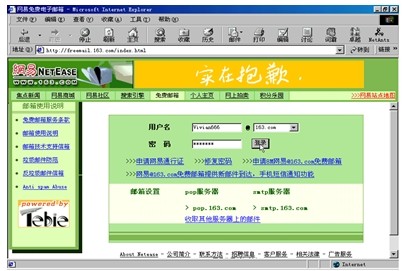 (1)拨号上网后,在IE中访问网易主页www.163.com,点击邮件系统的超级链接,进入邮件登录页面,在"用户名"位置输入账号,例如:"vivian666",在"密码"位置输入申请账号时设置的密码,然后点击"登录"按钮,如图2-26所示。