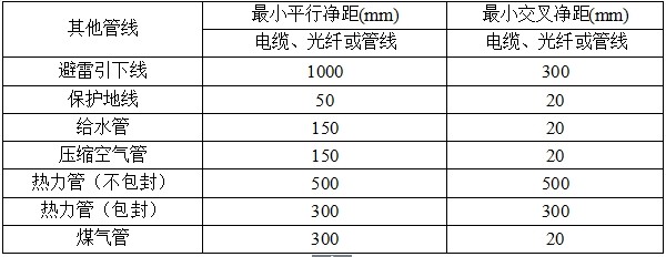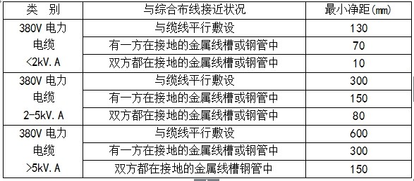 (5)当综合布线路由上存在干扰源,且不能满足最小净距要求时,宜采用金属管线进行屏蔽。综合布线电缆与附近可能产生高频电磁干扰的电动机、电力变压器等电气设备之间应保持必要的间距。 综合布线电缆与电力电缆的间距应符合表3-2的规定。墙上敷设的综合布线电缆、光纤及管线与其他管线的间距应符合表3-3的规定。