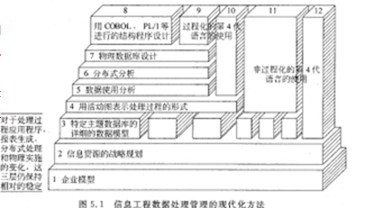 JamesMartin给出了企业信息工作的技术模型,图5.1是以现代化方法对企业数据处理系统进行建设的一种模式。它的各个技术步骤在JamesMartin的著作中都有论述,而本章只涉及底层的两个模块。