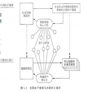 图5.2说明了信息资源规划工作中,信息资源规划者自顶向下的规划和数据管理员自底向上进行详细设计工作之间的相互关系。自顶向下的规划者应着眼于全企业,决定企业需要的数据库和其他数据资源。数据管理员则对收集的数据进行分析并综合成所要建立的每个数据库。