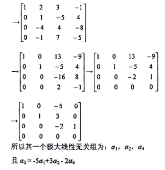 以所有向量为列向量形成4*4矩阵,然后对该矩阵施行初等变换化为行阶梯形矩阵
