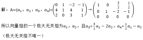 求向量组,,,的一个极大线性无关组,并将其余向量由该极大线性无关组线性表出。