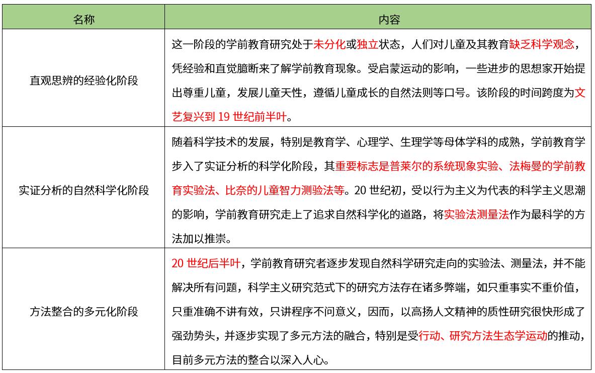 【考点】本题考查幼儿园教师应做什么样的研究-幼儿园教师适宜的研究方法-方法演进中的幼儿园教师研究【解析】直观思辨的经验化阶段。这一阶段的学前教育研究处于未分化或独立状态,人们对儿童及其教育缺乏科学观念,凭经验和直觉臆断来了解学前教育现象。受启蒙运动的影响,一些进步的思想家开始提出尊重儿童,发展儿童天性,遵循儿童成长的自然法则等口号。该阶段的时间跨度为文艺复兴到19世纪前半叶。故本题选A。【希赛点拨】