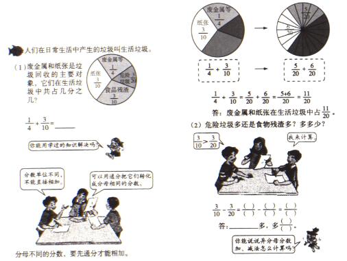 (3)教学环节:①谈话导人两周前,老师布置了一项调查、收集资料的作业:调査自己生活的社区主要有哪些生活垃圾,每种垃圾大约占生活垃圾的几分之几。②教学实施首先,交流调查情况,并提出问题。请学生将课前调査的情况进行交流,触发联想,让异分母分数加、减法的教学融入环境教育中。老师:我们知道纸张和废金属是垃圾回收的主要对象,它们在生活垃圾中共占几分之几呢?其次,请学生列出算式:3/10+1/4第一步:探讨3/10+1/4的算法。老师巡视,然后将学生中的几种不同算法列举在黑板上。第二步:集体评价。让学生分别对上述几种计算方法进行评价。达成共识:先找10和4的最小公倍数,通分后再相加,单位不同的两个分数是不能直接相加的。第三步:归纳异分母分数加法的计算方法。在集体评价的基础上,老师说明:由于10和4的最小公倍数是20,所以把圆平均分成20份,这样3/10变成6/20,1/4变成5/20,所以3/10+1/4变成6/20+5/20。在学生归纳的基础上,老师请学生打开教材,让学生将自己表述的语言和教材上的文字语言进行对照,学会用简明扼要的语言归纳异分母分数加法的计算方法。最后,设置练习题,学生利用已有经验验算,学生完成后,集体讲评。然后请学生表达计算的过程。在学生说算法的基础上,老师引导归纳:异分母分数相减,也是先通分再相减。接着归纳异分母分数加、减法的计算方法。再让学生完成其他两道小题。让学生自己归纳,然后在全班交流,最后老师小结:异分母分数加、减法的计算方法是先通分,然后按同分母分数加、减法的计算方法进行计算。③思维训练设计新的练习题,增加难度。④课堂小结本节课我们研究了异分母分数加、减法的计算方法。一般情况下,计算异分母分数的加、减法时,先通分,转化成同分母分数的加、减法,然后按同分母分数加、减法的计算方法进行计算。注意在通分时,为了计算简便,应选择分母的最小公倍数作公分母。