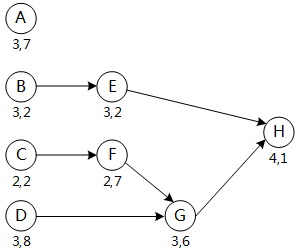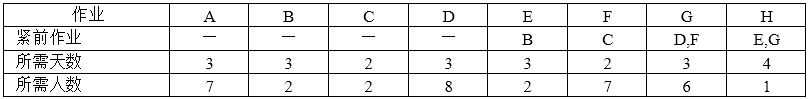 某工程项目包括8个作业A~H。各作业的紧前作业、所需天数、所需人数见下表: