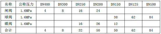 施工中,采购的第一批阀门(见表1-3)按计划到达施工现场,施工人员对阀门开箱检查,按规范要求进行了强度和严密性试验,主干管上起切断作用的DN400、DN300 阀门和其他规格的阀门抽查均无渗漏,验收合格。