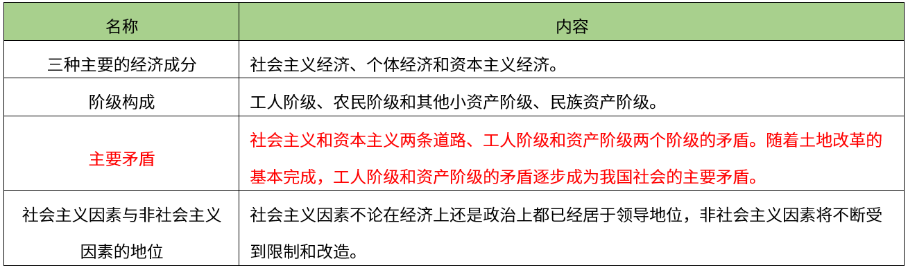 【解析】随着土地改革的基本完成,我国社会主要矛盾逐步成为工人阶级和资产阶级的矛盾。A项帝国主义和中华民族的矛盾和B项封建主义和人民大众的矛盾是近代中国社会的主要矛盾;D项农民阶级应改为资产阶级。故本题选C。【希赛点拨】新民主主义社会的特点: