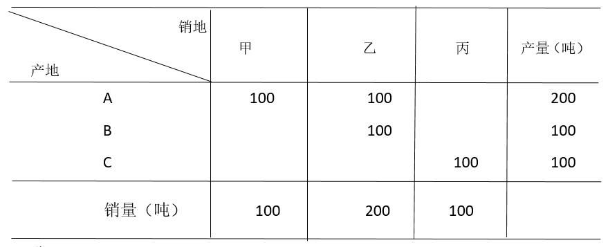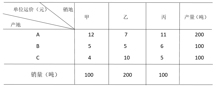 答案:设X11 、X12、X13分别为由产地A运往销地甲、乙、丙的数量(吨), X21 、X22、X23分别为由产地B运往销地甲、乙、丙的数量(吨 ),X31 、X32、X33分别为由产地C运往销地甲、乙、丙的数量(吨),总的运输成本是S。模型如下: