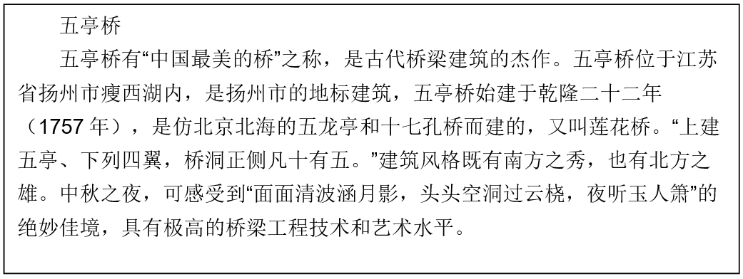 写出完成下列要求所需的操作步骤:(1) 将标题“五亭桥”设置为:字体“楷体_GB2312”,字号“小二”,且居中对齐;(2)用“查找/替换”方法将正文中的所有“五亭桥”字体设置为“黑体”;(3)将正文首行缩进二个字符,行距设置为1.5倍。