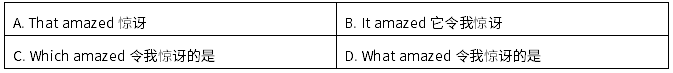 【选项释义】【考查点】主语从句【解题思路】如果选择A,B选项,It/that amazed me most已经是完整句,后应该跟从句(例:that引导的从句)而不是was that,排除A,B选项。该句缺少主语,为主语从句。which不能引导没有限定词的主语从句,所以选择D选项。【句意】最令我惊讶的是,这个在车祸中失去双臂的小男孩竟能够用脚使用钢笔。