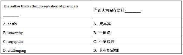【解题思路】根据题干关键词preservation of plastics可以定位到文章第六段第一句“尽管有范·奥斯藤这样的成功故事,但塑料的保存可能会变得越来越困难(get harder)”,说明作者认为保存塑料是非常困难、充满挑战的。因此D选项“具有挑战性”正确。