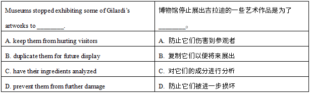 【解题思路】根据题干关键词stopped exhibiting可以定位到文章第四段最后一句“博物馆把其中一些锁在了暗室中(locked some of them away in the dark)”,上文分析了其原因“他用的聚氨酯泡沫本身就不稳定(inherently unstable)。特别容易受到光照伤害(light damage)”,而且“到20世纪90年代中期,吉拉迪的南瓜、玫瑰和其他塑像已经开裂、破碎(splitting and crumbling)”,由此可知博物馆停止展出吉拉迪的一些艺术作品是为了防止它们遭受进一步的光照伤害。因此D选项“防止它们被进一步损坏”正确。