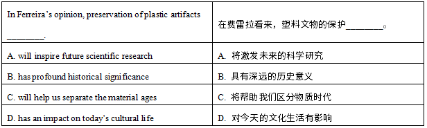 【解题思路】根据题干关键词Ferreira可以定位到文章最后一段最后一句“我们今天决定收集什么,我们决定保存什么……将对我们未来的形象产生强烈影响(have a strong impact on how in the future we’ll be seen)”,说明费雷拉认为保护塑料文物会影响到后代如何看待、评价我们,其历史意义是非常深远的。因此B选项“具有深远的历史意义”正确。