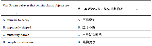 【解题思路】根据题干关键词Van Oosten可以定位到文章第二段第一句“聚合物化学家西娅·范·奥斯藤在荷兰文化遗产局工作了几十年,直到几年前退休,她说,某些艺术品特别容易受到破坏,因为一些造型艺术的先驱并不总是知道如何正确地混合材料(didn’t always know how to mix ingredients properly)”,说明奥斯藤认为艺术家在创作时因为不会正确地混合材料,导致艺术品被创作出来时就已经存在缺陷。因此C选项“本身就有缺陷”正确。