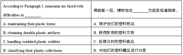 【解题思路】根据题干关键词museums可以定位到文章第一段第六句“所有这些都给博物馆等机构带来了巨大的麻烦(creates huge headaches for institutions, such as museums),它们试图保护具有重要文化意义的文物(preserve culturally important objects)”,说明博物馆面临的困难在于难以保护塑料制品的文物。因此A选项“维护他们的塑料物品”正确。