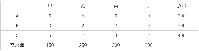 【考生回忆版】有三个原料产地ABC,产量分别为200吨、300吨、400吨;四个销地甲乙丙丁,需求量分别为150吨、250吨、300吨、200吨。各产地到销地的运费如下表所示(单位:千元/吨),则采取总运费最小的方案时,总运费是( )千元。