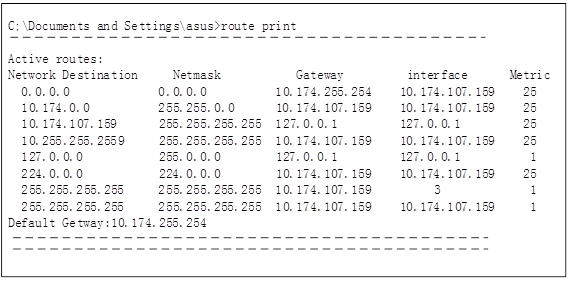 这表示发向任意网段的数据通过本机接口10.174.107.159被送往一个默认的网关:10.174.255.254,它的管理距离是25,这里管理距离指的是在路径选择的过程中信息的可信度,管理距离越小的,可信度越高。