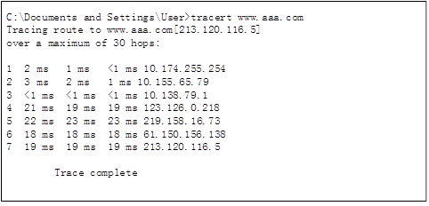 在PC1中运行tracert www.aaa.com命令后,显示结果如图1-2所示。
