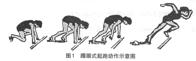 同学们,今天我们学习蹲踞式起跑,下面先看一下动作图解(给同学们展示蹲踞式起跑动作示意图,见图1)。现在我给大家示范蹲踞式起跑动作,并讲解动作要领,希望大家认真听和仔细观察。