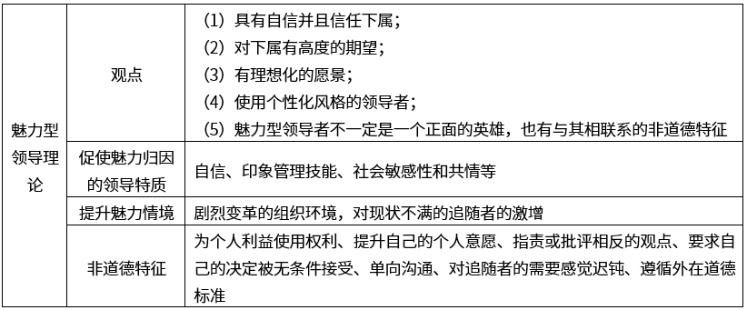 魅力型领导者是指具有自信并且信任下属,对下属有高度的期望,有理想化的愿景和个性化风格的领导者。魅力型领导者的追随者认同他们的领导者及其安排的任务,表现出对领导者的高度忠诚和信心,效仿其价值观和行为,并且从自身与领导者的关系中获得自尊。