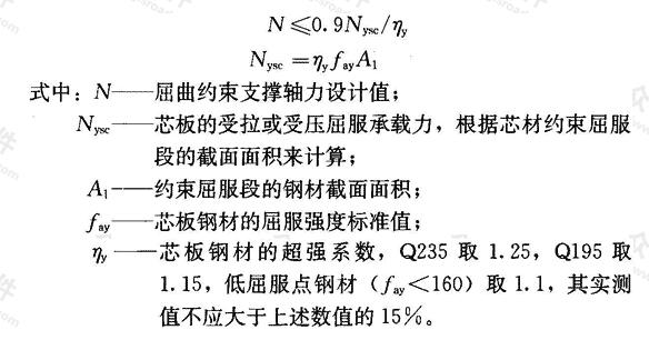 本次修订,考虑了设置屈曲约束支撑框架的情况。屈曲约束支撑是由芯材、约束芯材屈曲的套管和位于芯材和套管间的无粘结材料及填充材料组成的一种支撑构件。这是一种受拉时同普通支撑而受压时承载力与受拉时相当且具有某种消能机制的支撑,采用单斜杆布置时宜成对设置。屈曲约束支撑在多遇地震下不发生屈曲,可按中心支撑设计;与∨形、∧形支撑相连的框架梁可不考虑支撑屈曲引起的竖向不平衡力。此时,需要控制屈曲约束支撑轴力设计值:
