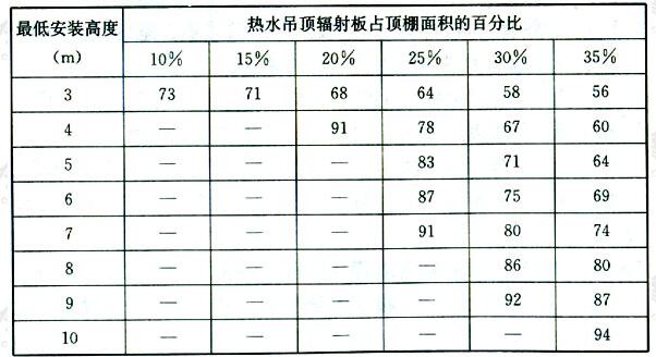 5.4.15 热水吊顶辐射板的安装高度,应根据人体的舒适度确定。辐射板的较高平均水温应根据辐射板安装高度和其面积占顶棚面积的比例按表5.4.15确定。
