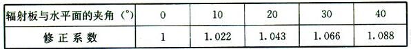 热水吊顶辐射板倾斜安装时,辐射板的有效散热量会随着安装角度的不同而变化。设计时,应根据不同的安装角度,按表5.4.14对总散热量进行修正。