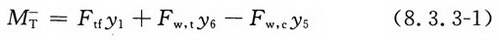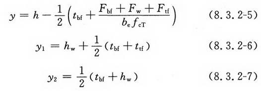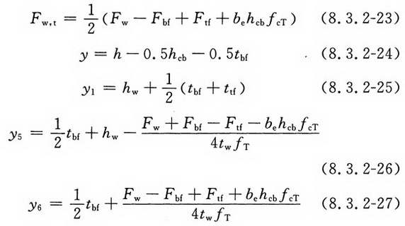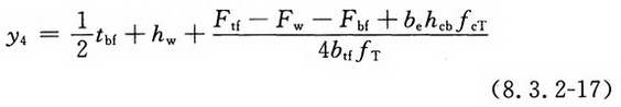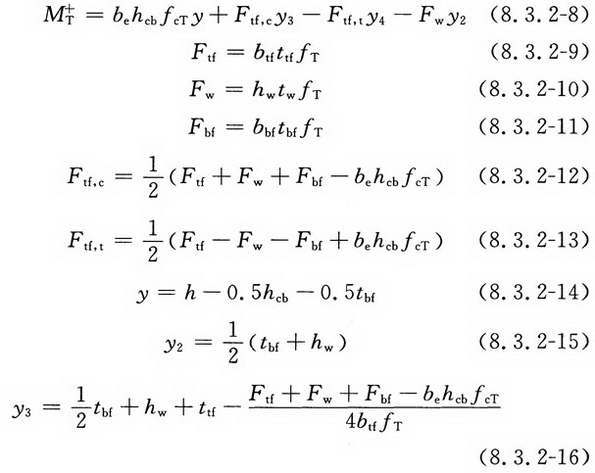 2 当塑性中和轴在钢梁上翼缘内(图8.3.2-2),即Fbf+Fw-Ftf<behcbfcT<Fbf+Fw+Ftf时,正弯矩承载力应按下式计算: