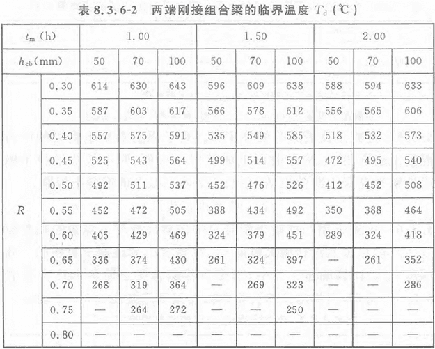 8.3.6 火灾下钢与混凝土组合梁中钢梁腹板与下翼缘的临界温度Td,应根据其设计耐火极限tm、荷载比R和混凝土翼板的等效厚度hcb经计算确定。其中,两端铰接组合梁的临界温度应按表8.3.6-1确定,两端刚接组合梁的临界温度应按表8.3.6-2确定。
